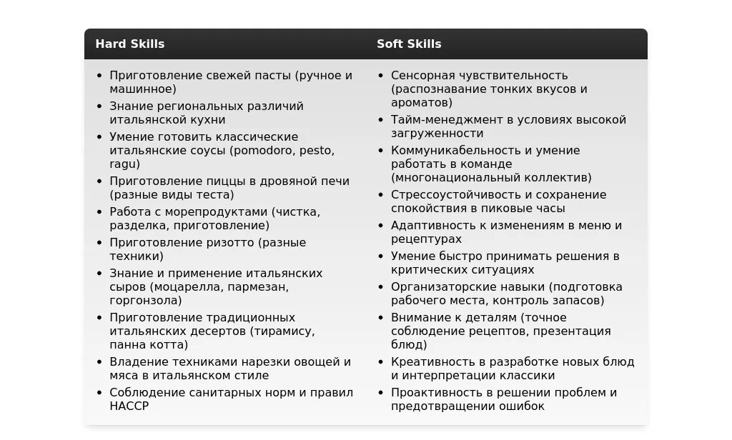 - Для траттории: "Приготовление традиционных итальянских блюд", "Знание региональных кухонь", "Работа в команде", "Соблюдение санитарных норм".