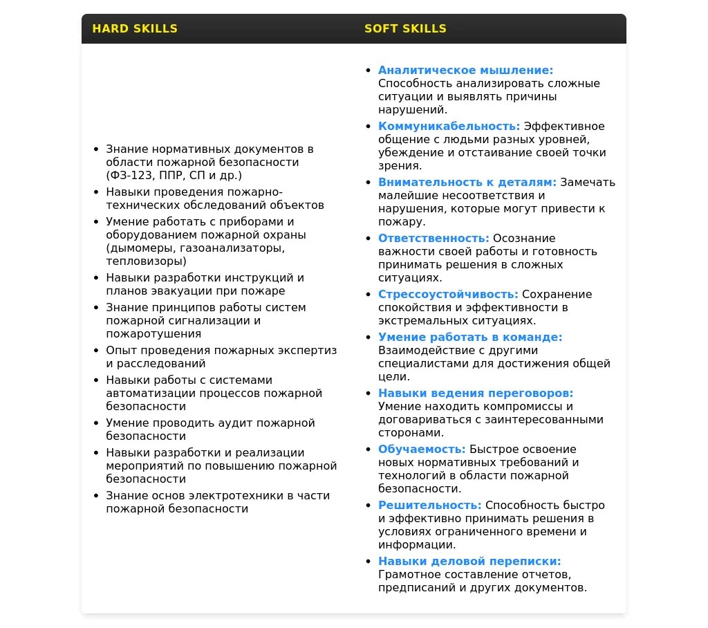 Ключевые слова в разделе "Навыки" помогут вашему резюме пройти автоматический отбор и привлечь внимание работодателя. Используйте термины и фразы, которые часто встречаются в описании вакансии и в профессиональной литературе по пожарной безопасности. Например: