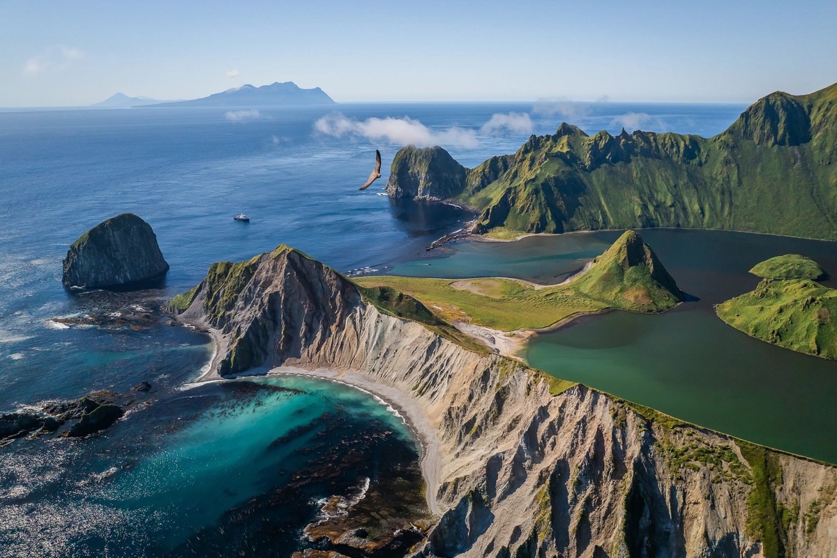 Первозданная красота. Снимок Ильи Труханова с конкурса РГО «Самая красивая». Фото было сделано на высоте птичьего полета (вон и птица для определения высоты) над островом Янкича — одного из двух островов субархипелага Ушишир, средней группы Большой гряды Курильских островов. Просто та самая красота, которую не задела цивилизация.