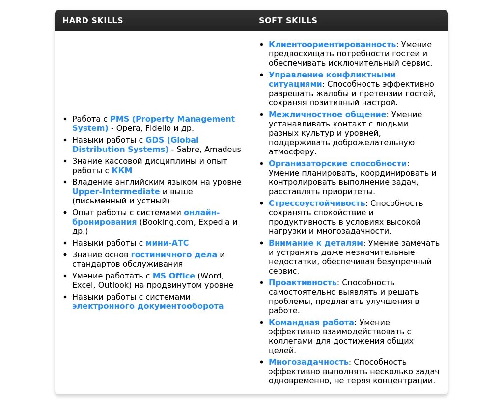 - Для работы в отелях высокого уровня: "Знание стандартов обслуживания 5*", "Опыт работы с программой Opera", "Свободное владение английским языком".