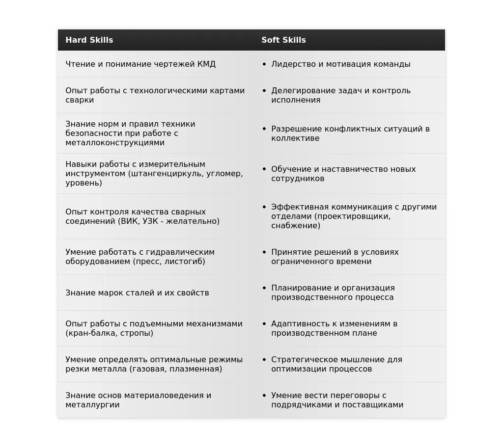 "Профессиональные навыки: Чтение чертежей (эксперт), знание технологии сварки (продвинутый), работа с измерительным инструментом (продвинутый). Навыки управления: Руководство бригадой, планирование работ, контроль качества. Личностные качества: Ответственность, умение работать в команде, стрессоустойчивость."