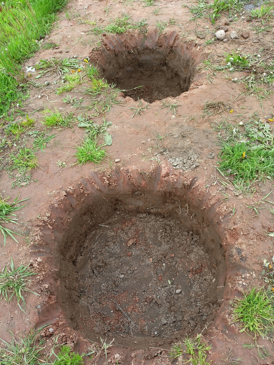 1. Выкопали ямы глубиной 50 см и диметром 70 см. Вокруг ямы у нас родной глинистый грунт.