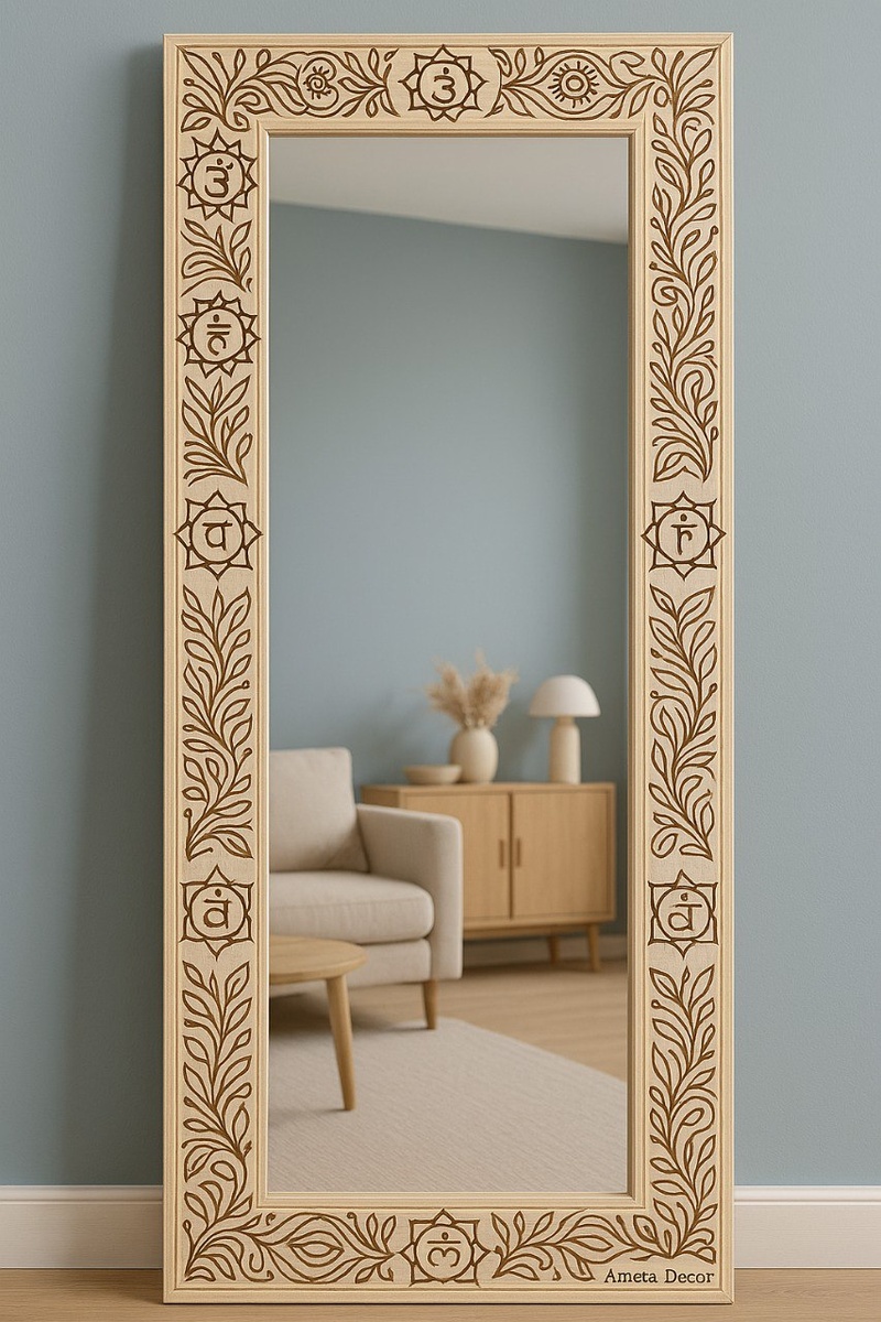 Зеркало "Парны": отражение смысла В мире, где правит скоротечность и пластик, по-прежнему остаётся место для вещей с душой. Таких, как это зеркало — "Парны". С первого взгляда — просто деревянная рама. Но если приглядеться… перед вами почти ритуальный объект. Он не просто отражает. Он вступает в диалог. 📐 Ручная работа, говорящая на своём языке Размер зеркала — внушительный. Это не аксессуар, а полноценный элемент пространства. Всё — от формы до материала — говорит о том, что оно здесь не для декора, а для идеи. Дерево покрыто натуральным воском, и, благодаря этому, живая текстура не запечатана, а дышит. Главное — орнамент. Вырезанный вручную, он идёт по всей поверхности рамы, будто плетённый венок из символов и знаков. Это не просто украшение — это зашифрованная история. Каждый завиток, каждый символ — часть ритма, будто отголоски северных рунических мотивов или волжского орнамента. Кто-то увидит здесь солнце, кто-то — знаки плодородия, кто-то — древо жизни. Но это зеркало не даёт