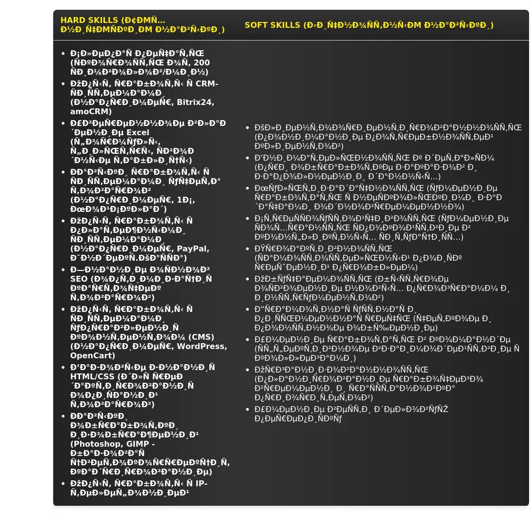 Раздел "Навыки" должен содержать список ваших ключевых компетенций, которые соответствуют требованиям вакансии.