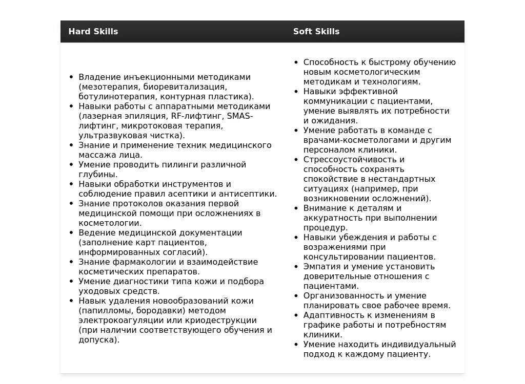 - Навыки: Перечень ваших навыков должен соответствовать требованиям вакансии. Сгруппируйте навыки по категориям (например, инъекционные техники, аппаратные методики, знание косметологических средств).