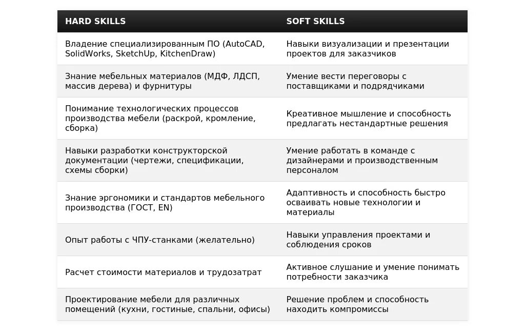 - Проектировщик корпусной мебели (производство на заказ): "Разработка конструкторской документации для индивидуальных проектов", "Работа с AutoCAD, SolidWorks", "Внимательность к деталям", "Понимание производственных процессов", "Опыт работы с мебелью на заказ".