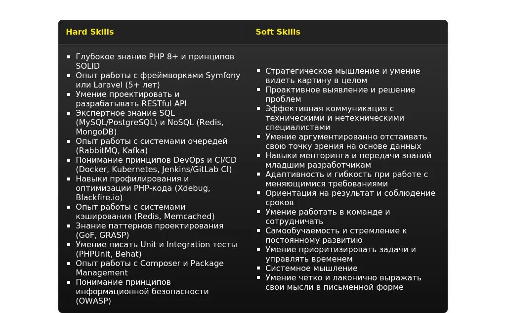 - Технические навыки: знание PHP, баз данных, фреймворков.