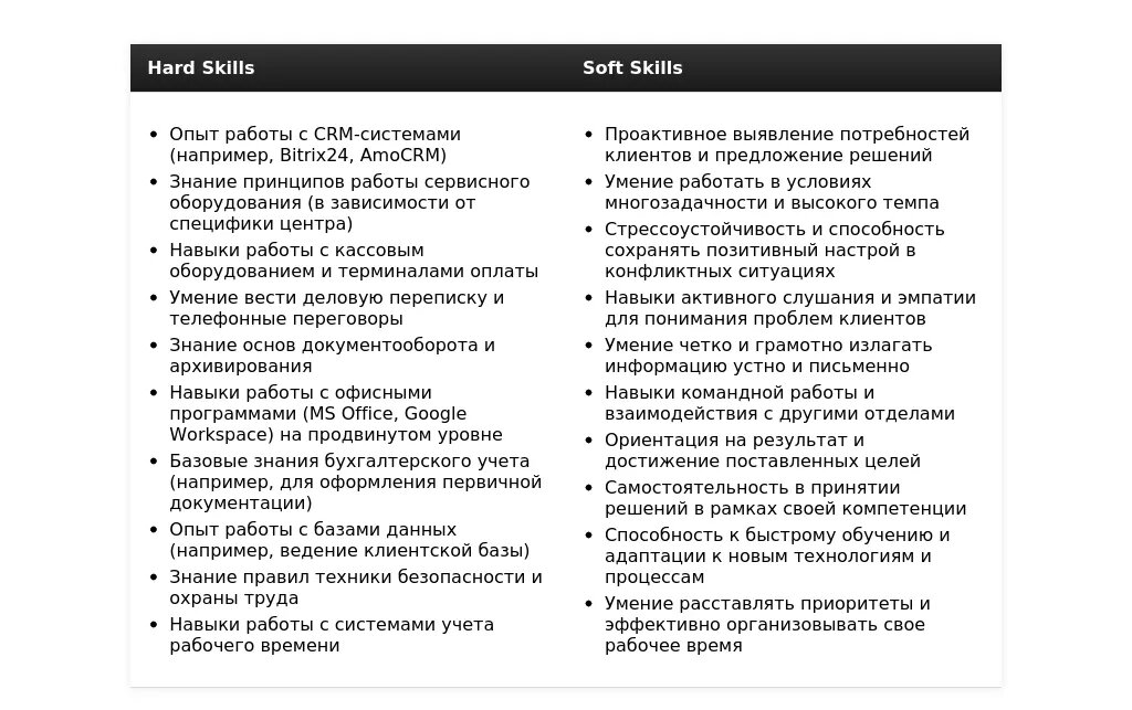 Раздел "Навыки" в резюме – это важная часть, которая позволяет работодателю быстро оценить ваши профессиональные компетенции. Адаптация этого раздела под конкретную вакансию администратора сервисного центра требует внимательного анализа требований вакансии и выделения наиболее релевантных навыков.