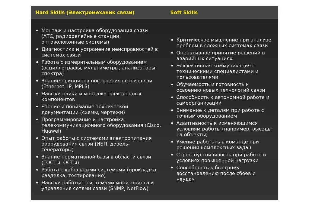 - Ошибка: Слишком общие фразы.❌ "Коммуникабельный, ответственный, быстро обучаюсь."✅ "Имею опыт работы с различными типами телекоммуникационного оборудования, включая Ericsson, Huawei и Cisco. Готов к решению сложных технических задач и быстро адаптируюсь к новым технологиям."