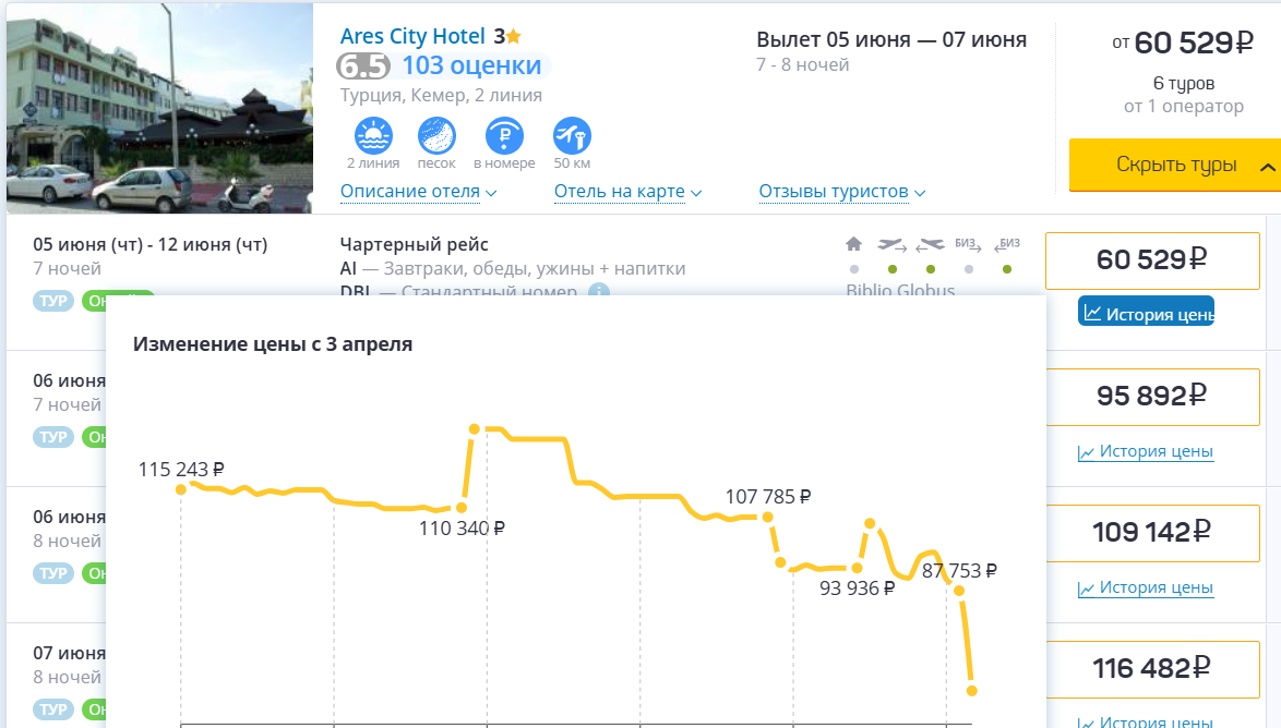 Тенденция не меняется пока. Лето началось, а Турция сразу начала "гореть". Буквально два дня назад я уже рассказывал, как туроператор Библиоглобус снижает цены И надо отметить, что цены держат до последнего. Еще утром 4 июня, путевки в Турцию с вылетом завтра, начинались от 79 т.р. жаль скрин не сделал. А уже поздно вечером вижу 60 т.р., даже ниже, чем пару дней назад И опять же, надо отметить четкую работу динамической цены, пока готовил публикацию, БГ все борта заполнил полностью и свободных мест на самолеты, на 5 июня, не осталось То есть, в течении дня, стоимость минимального по цене пакетного тура упала на 25%, а если брать максимальные уровни, то почти в 2 раза. Но так будет происходить не всегда и не каждый день. Да и поймать удачу не так просто. Тут придется выбирать из того, что есть в наличии и по факту и постоянно сидеть на чемоданах и быть готовым сорваться в аэропорт в любой момент. Как и я говорил многократно, хорошие и востребованные отели лучше бронировать заранее