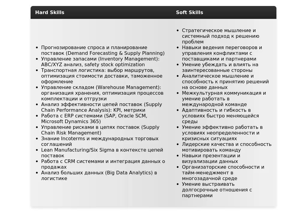 - Обязательная информация:Ключевые навыки и компетенции, релевантные для Supply Chain Specialist.