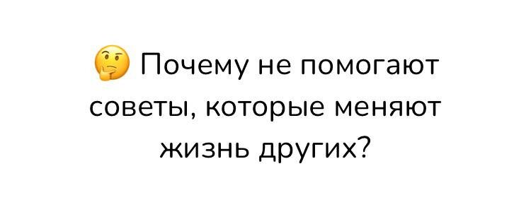 🤔 Почему не помогают советы, которые меняют жизнь других? Бывало такое: вы прочитали книгу, которая изменила жизнь вашей знакомой, но у вас ничего не поменялось? Или друг говорит: «Не принимай близко к сердцу», а вам это совершенно не помогает? Почему так происходит, если вроде бы ситуации похожи? 🌌 Каждый человек уникален — со своим набором генов, личной историей, темпераментом и восприятием мира. Это делает каждого из нас неповторимым, как рисунок снежинки. Даже если ситуации выглядят похожими, вы и ваш знакомый заметите в них абсолютно разные детали. Кто-то обратит внимание на проблему, кто-то на решение, а кто-то увидит совершенно иное. 🧠 Наши личные установки — это внутренние фильтры, которые мы создаём на протяжении всей жизни. Именно они влияют на то, как мы воспринимаем ситуации и реагируем на них. Поэтому одна и та же рекомендация может вызывать совершенно разные реакции. 🌍 Представьте двух людей в схожих обстоятельствах. На самом деле их ситуации будут настолько раз