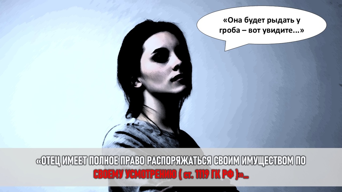 Недостойные наследники (ст. 1117 ГК РФ): Отец может попытаться доказать в суде, что героиня – "недостойный наследник". Основания: если она умышленно противодействовал осуществлению его последней воли (например, подделала завещание), либо совершала противоправные действия против него или других наследников (угрозы, насилие, доведение до самоубийства и т.д.). Обычный отказ общаться или помогать с сестрой НЕ ЯВЛЯЕТСЯ основанием для признания недостойным наследником! Шансы отца на успех здесь мизерные. - Вывод: Угроза отца реальна. Он действительно может лишить героиню наследства через завещание. Юридических рычагов, чтобы это предотвратить (если она не имеет права на обязательную долю), практически нет. Стратегия героини: Быть готовой к тому, что она не получит ничего. Строить свою жизнь, не рассчитывая на его имущество. Любые попытки "задобрить" отца ради наследства – путь к дальнейшим манипуляциям и моральному надлому.
