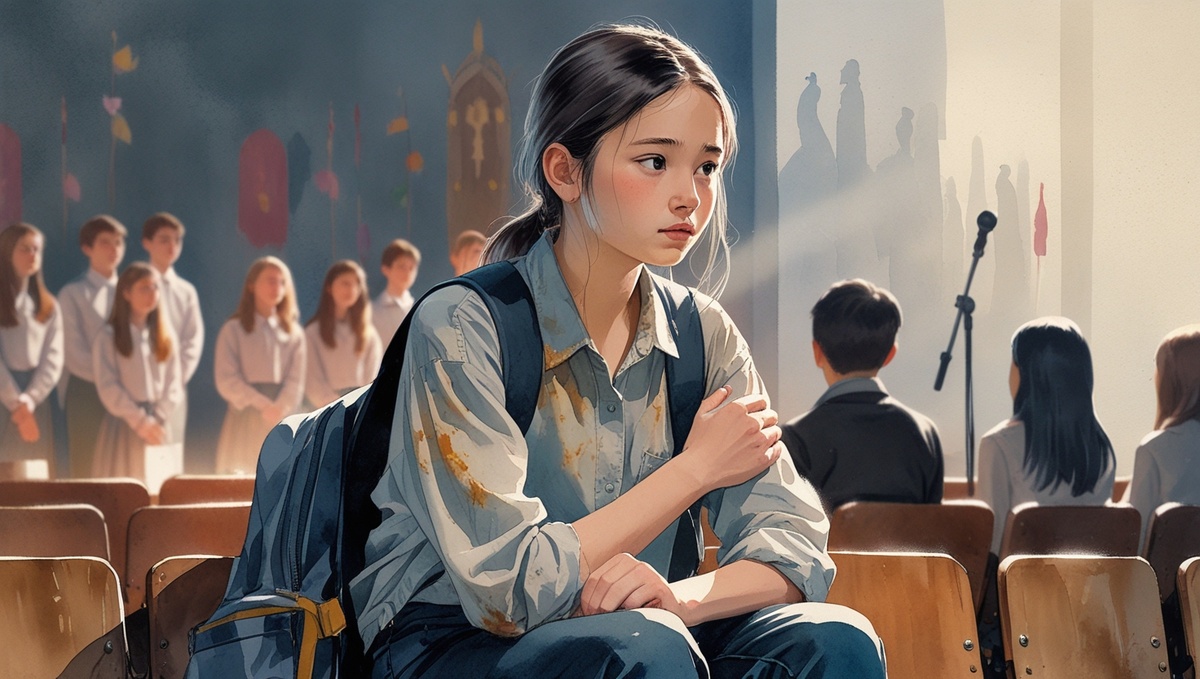 Когда кто-то случайно (или нет) пролил на меня вишнёвый сок, я даже не сразу поняла. Тёплое пятно на груди, кто-то хихикает — «теперь не пятно, теперь клякса». Я не плакала. Просто пошла в туалет. Заперлась в кабинке. Села. Держала куртку на коленях, смотрела в пол.