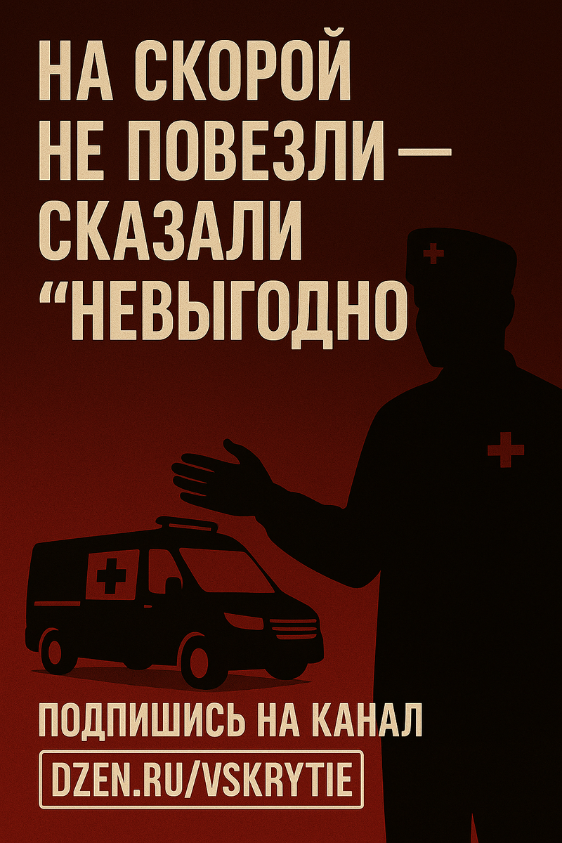А потом сказал: “Нет показаний для госпитализации.” Хотя ты задыхаешься, сердце колотится, лицо бледное. Ты спрашиваешь: — “Мне плохо. Почему не везёте?” А он отвечает: “Ну а зачем? Там всё равно не примут. Только очередь займёшь.” Но правда не в этом. Правда в том, что везти тебя — невыгодно. Скорая помощь — это тоже бизнес. Каждая поездка, каждое оформление, каждый госпитализированный — это строчка в отчёте, код в системе, деньги от ФОМС. Но есть нюансы: Значит — лучше не везти вообще. Ты дешевле, если ты на месте. На таких смотрят, оформляют вызов, делают вид, что осмотрели — и уезжают. А ты? Ты остаёшься дома. Помирать. Родственники вызвали скорую: 82 года, лихорадка, спутанность сознания. Приехали, дали парацетамол, давление померили. Сказали: “Температура — не показание для госпитализации. Пусть пьёт.” Через 8 часов — инсульт. Через сутки — смерть. В карте: “от госпитализации отказались”. Родственники в шоке. Подпись — подделана. А скорая — уехала дальше. Если тебя не примут — бр