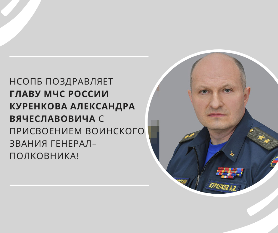 НСОПБ поздравляет главу МЧС России Куренкова Александра Вячеславовича с присвоением воинского звания генерал-полковника!