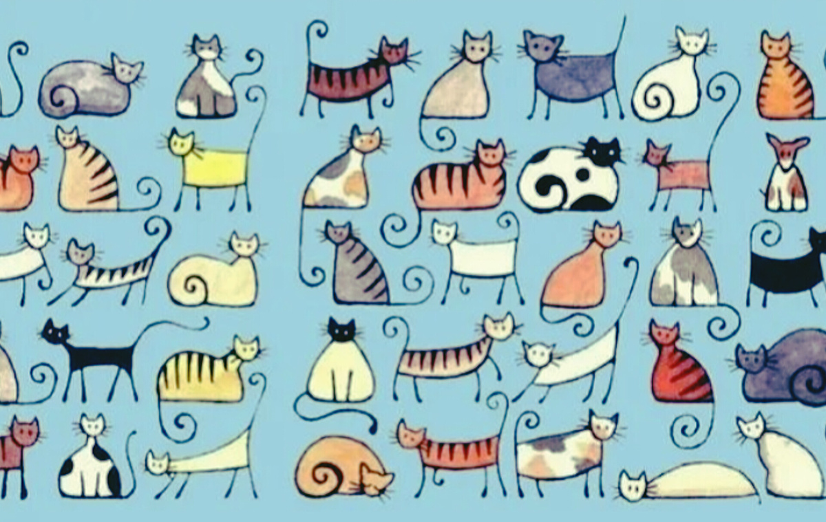 А теперь смотрите внимательно. Перед вами такой уютный рисунок. Там просто уйма кошек. Целое пушистое кошачье царство! Но вот незадача: среди этих мохнатых, усатых и хвостатых спрятался один… кролик. Да-да, самый настоящий кролик. Он такой хитрый, так ловко сливается с этой пушистой толпой, что его очень трудно заметить с первого взгляда. Но я уверена, что вы сможете его найти!