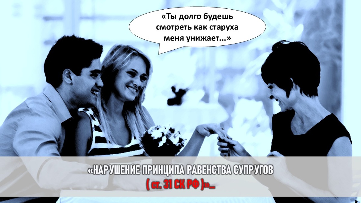 Нарушение принципа равенства супругов (ст. 31 СК РФ): Он позволил матери вмешаться и диктовать правила в его будущих супружеских отношениях, не считаясь с чувствами и мнением невесты.