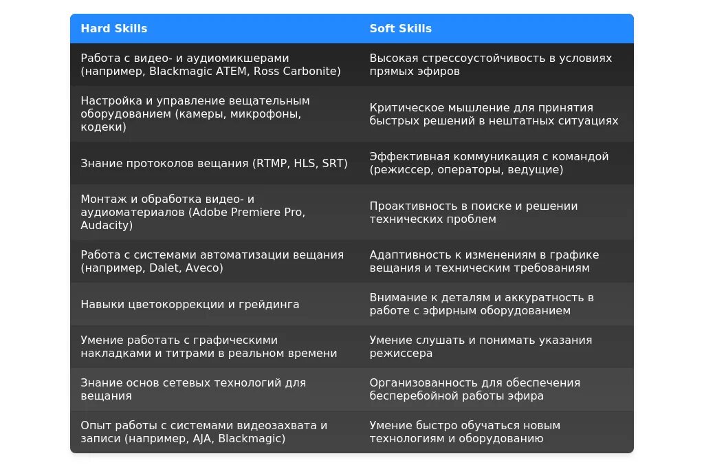 - На какие качества и навыки делать акцент: Знание программного обеспечения для вещания, понимание основ теле- и радиопроизводства, умение работать в команде, быстрая обучаемость, способность оперативно решать проблемы.