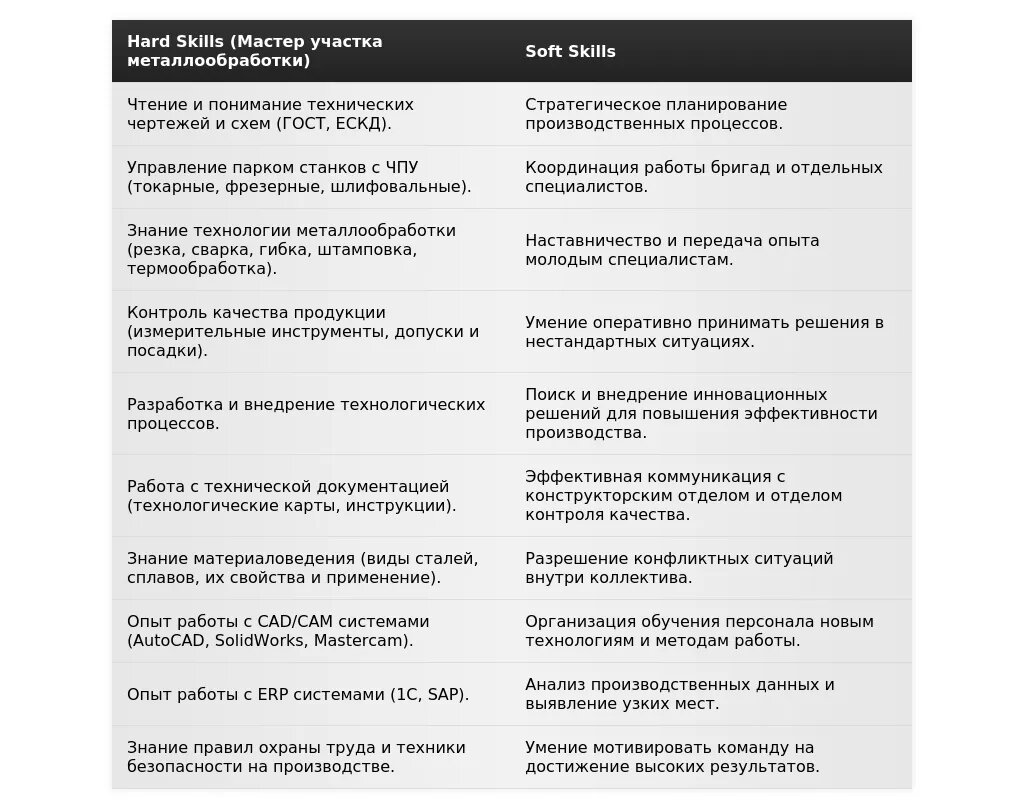 - На какие качества и навыки делать акцент: Внимательность к деталям, ответственность, умение работать в команде, знание технологических процессов металлообработки, навыки работы с чертежами и технической документацией, готовность к обучению.