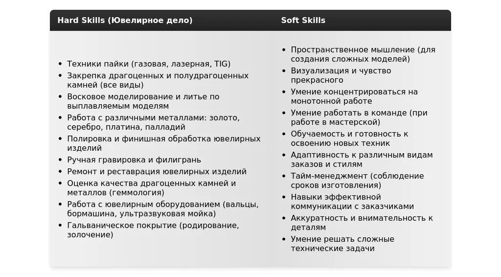 - Навыки: Перечислите все ваши навыки, относящиеся к ювелирному делу, и выделите те, которые требуются в данной вакансии.