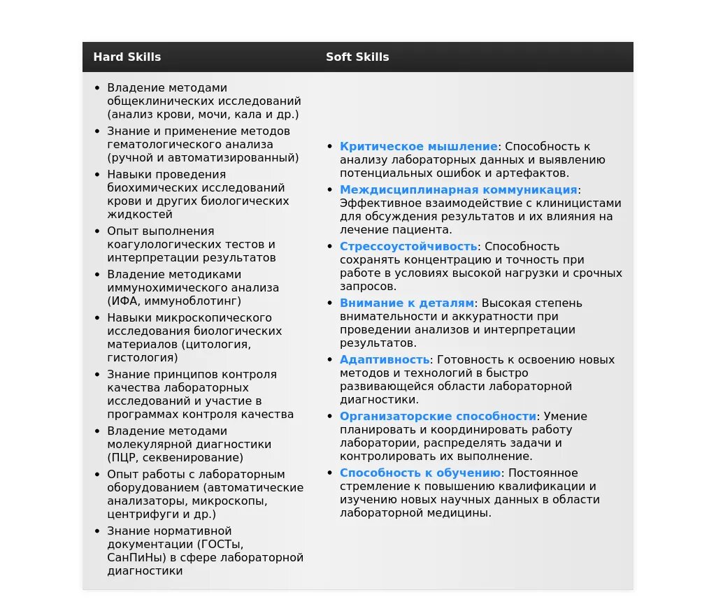 - Профессиональные: Владение всеми основными методами лабораторной диагностики, опыт работы на современном оборудовании, знание требований нормативных документов в области КЛД.