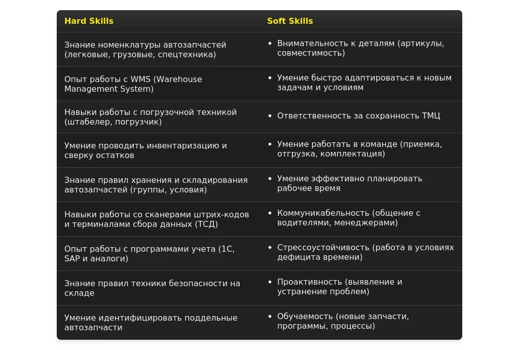 Скрытые: Высокая скорость работы (комплектовщик), внимательность к деталям (автозапчасти требуют точной идентификации).