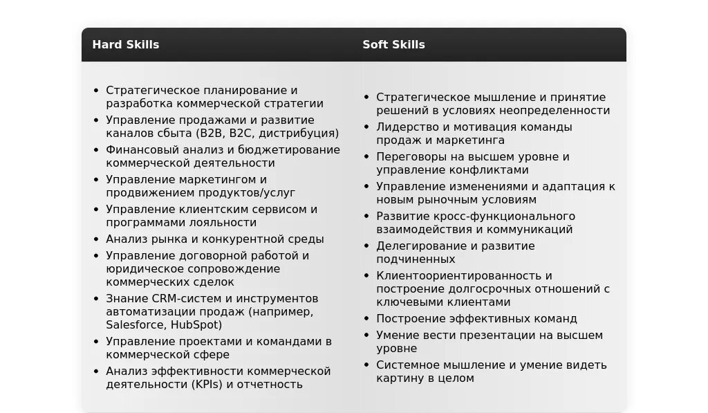 - Что обязательно включить:Ключевые навыки и компетенции, релевантные для позиции заместителя генерального директора по коммерческой деятельности.