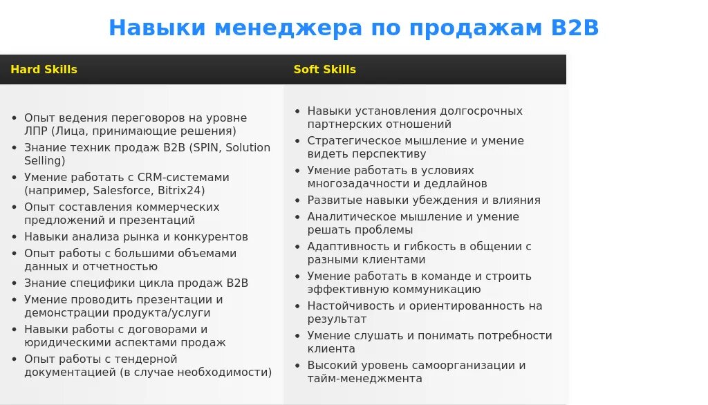"Навыки: - Навыки продаж: - B2B продажи (Продвинутый) - Проведение презентаций и переговоров (Продвинутый) - Работа с возражениями (Средний) - Навыки работы с клиентами: - Установление долгосрочных отношений с клиентами (Продвинутый) - Ведение клиентской базы в CRM-системе (Продвинутый) - Технические навыки: - MS Office (Продвинутый) - CRM (Salesforce, Bitrix24) (Продвинутый)"