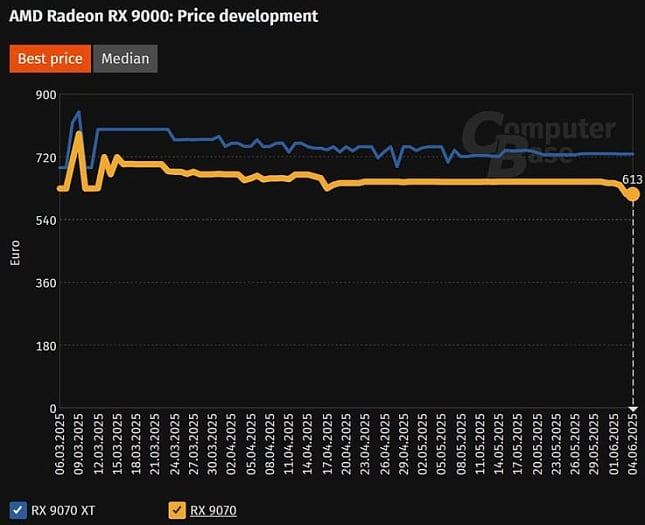 На фоне приближающегося релиза Radeon RX 9060 XT, старшие модели поколения RDNA 4 от AMD продолжают удерживать позиции в более высоком сегменте. Однако сегодня появилась первая ласточка в вопросе ценообразования: Radeon RX 9070 неожиданно опустилась ниже рекомендованной розничной цены, пусть и ненадолго. Снижение стоимости заметили аналитики ComputerBase, зафиксировав цену на уровне €613 — на 16 евро меньше РРЦ, установленной для рынка Германии. Однако распродажа длилась недолго: предложение исчезло столь же быстро, как и появилось. Тем не менее это — важный сигнал: цены начинают «проседать», пусть пока и точечно. Напомним, что ранее AMD пообещала улучшить доступность и ценовую политику своих видеокарт Radeon RX 9000-серии, включая RX 9070 XT и RX 9070. По доступности действительно наблюдается прогресс, но с ценами всё ещё непросто. Если производители и ритейлеры начнут более активно корректировать ценники, RX 9070 может стать более интересной альтернативой RTX 5070, особенно с учётом