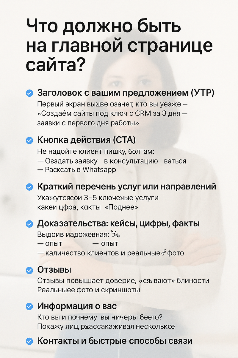 Многие делают её «красивой», но забывают о главном — структуре и логике продаж. Разберём, что должно быть на главной, чтобы она не просто была, а работала. Первый экран — это ваше "здравствуйте".