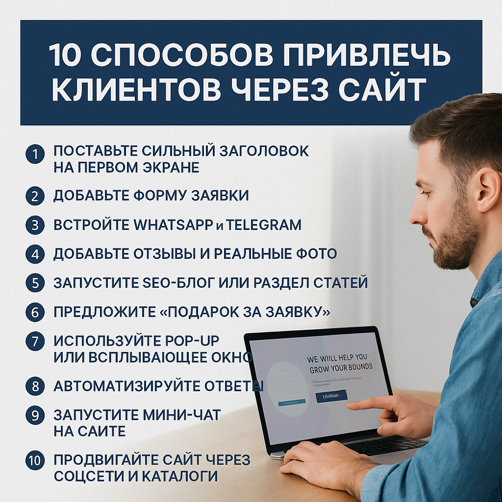 Сайт — это не просто «электронная визитка». Это полноценный инструмент продаж, который может привлекать клиентов ежедневно, без рекламы и танцев с бубном. Но чтобы сайт работал, важно не просто его иметь, а грамотно использовать. Делимся 10 рабочими способами, как превратить сайт в источник клиентов. Люди должны за 3 секунды понять: