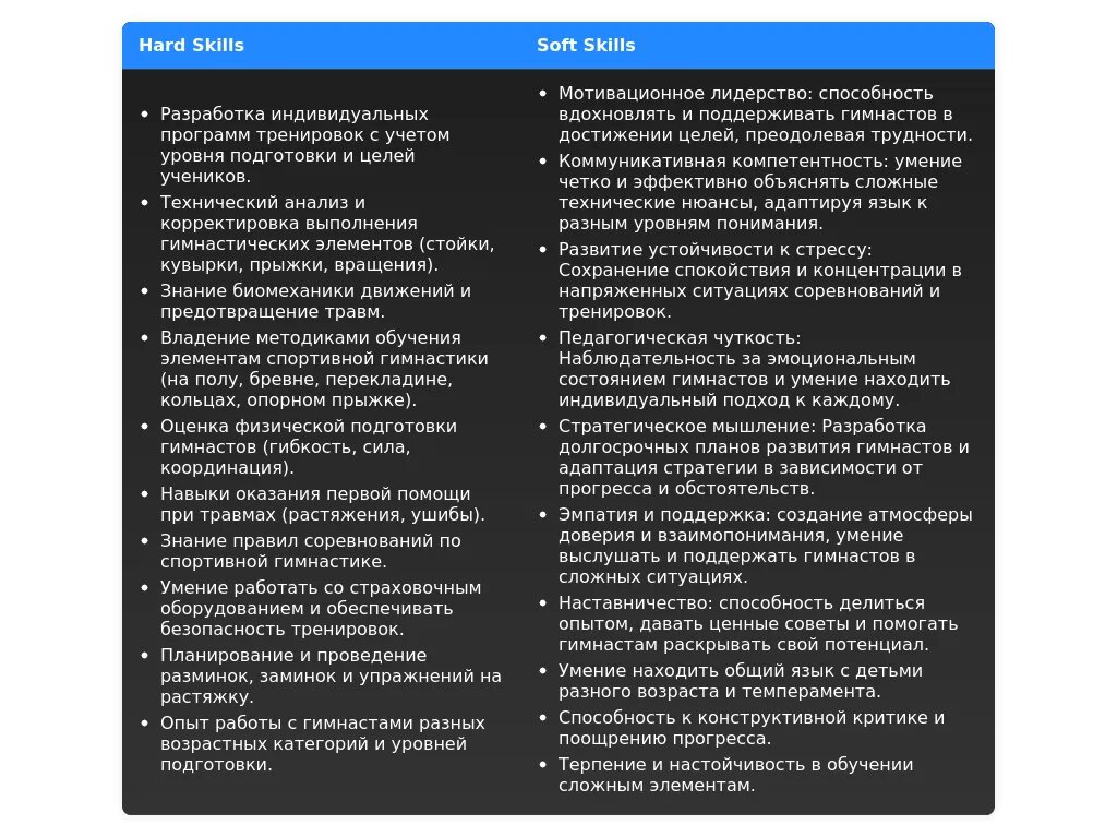 - На какие качества и навыки делать акцент: Терпение, коммуникабельность, умение находить подход к детям, знание методик обучения гимнастическим упражнениям, ответственность.