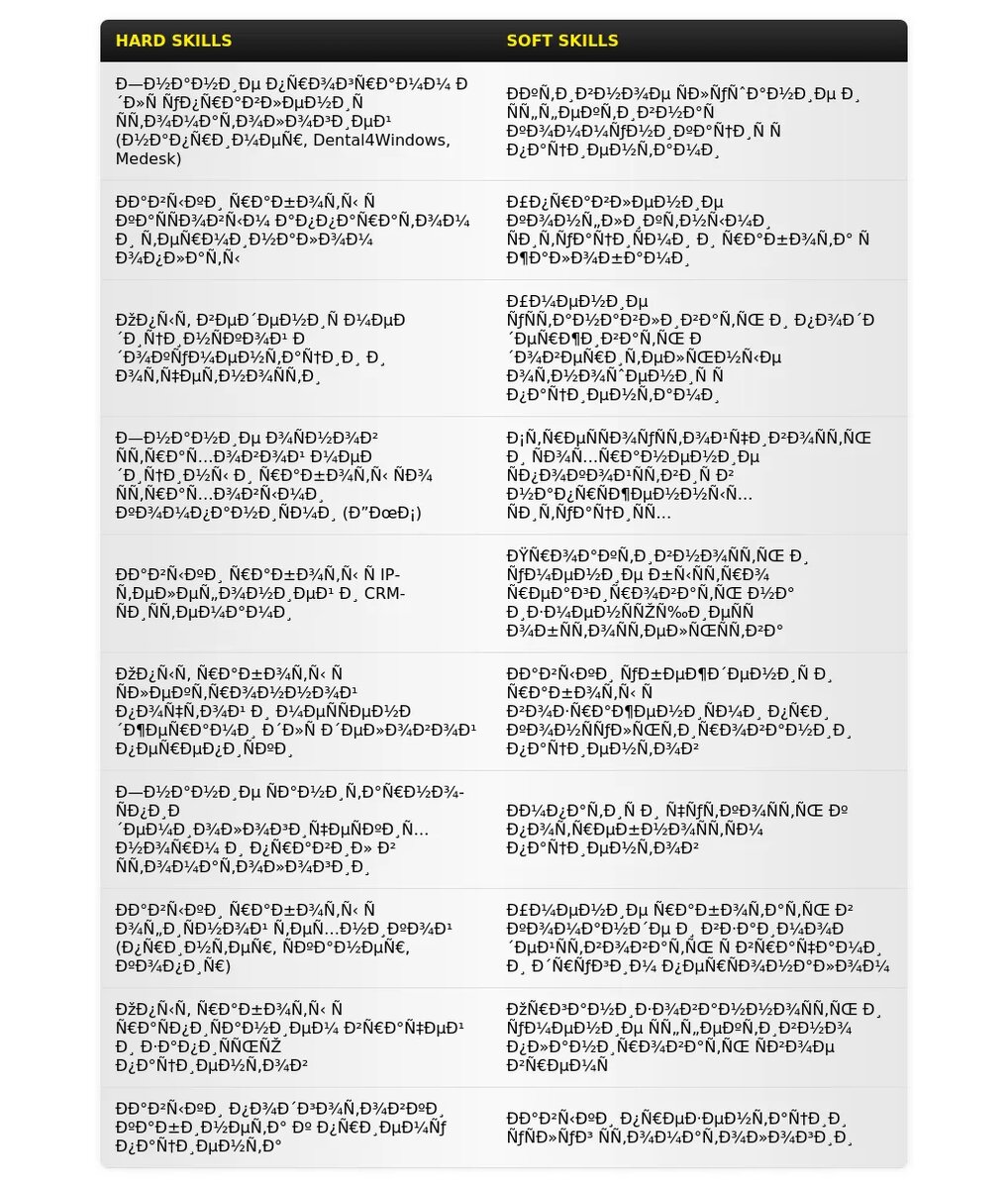 - Навыки: Перечень навыков должен соответствовать требованиям работодателя и подчеркивать ваши сильные стороны.