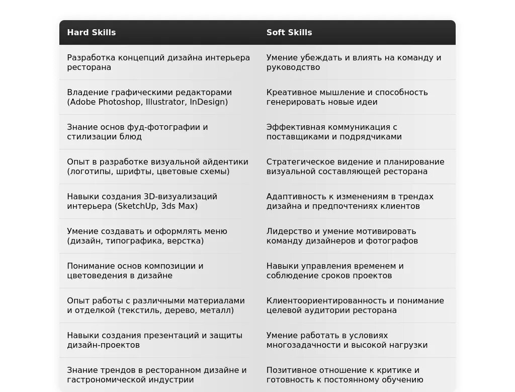 Скрытые требования: Чувство стиля и элегантности, умение создавать уникальные и запоминающиеся образы, понимание высокой кухни.