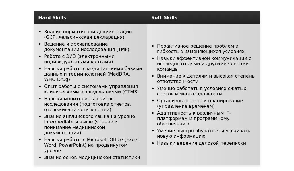 "Навыки: Работа с медицинской документацией, знание GCP, MS Office (Word, Excel, PowerPoint), английский язык (письменный и устный), коммуникабельность, внимательность к деталям."