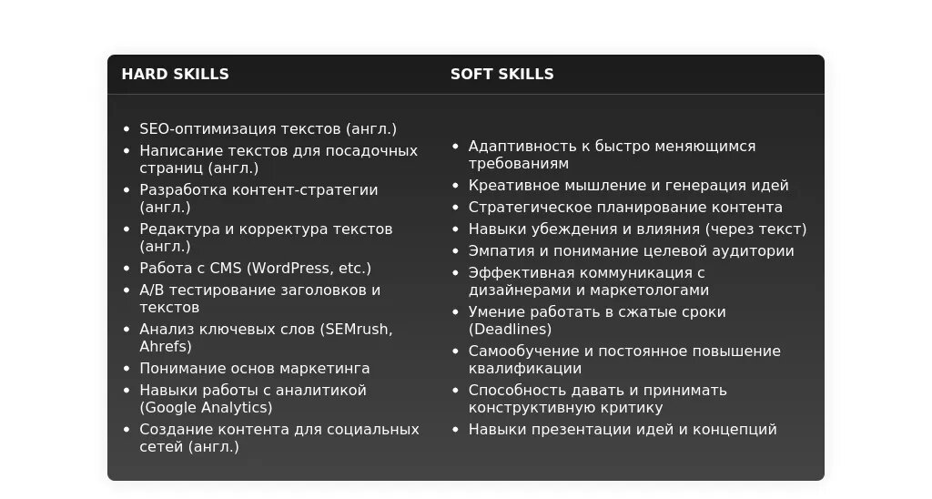 - Для IT-компаний: "Разработка технических текстов", "SEO-оптимизация контента", "Работа с CMS", "Знание IT-терминологии", "Создание white papers и кейсов".