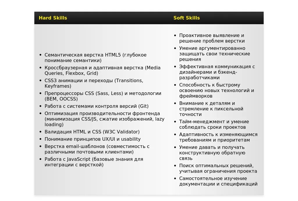 - Ошибка: Перечисление всего, что знаете, без акцента на главном."Знаю HTML, CSS, JavaScript, jQuery, Bootstrap, Flexbox, Grid...""HTML-CSS верстальщик с опытом адаптивной и кроссбраузерной верстки, уверенно владею HTML5, CSS3, Flexbox и Grid. Имею опыт работы с JavaScript и jQuery."