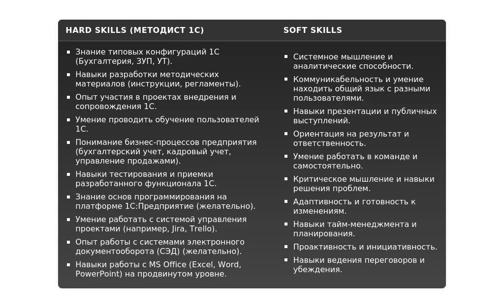 - Что обязательно включить:Ключевые навыки и компетенции, релевантные для методиста 1С (например, знание конфигураций 1С, опыт внедрения, навыки обучения пользователей).