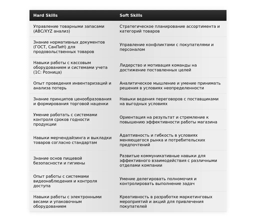 "Управленческие навыки: Управление персоналом, мотивация сотрудников, планирование и организация работы магазина. Навыки работы с товаром: Управление товарным запасом, знание основ товароведения, контроль за качеством продукции. Навыки работы с клиентами: Обслуживание клиентов, разрешение конфликтных ситуаций, увеличение лояльности покупателей. Компьютерные навыки: 1С: Управление торговлей, MS Office."