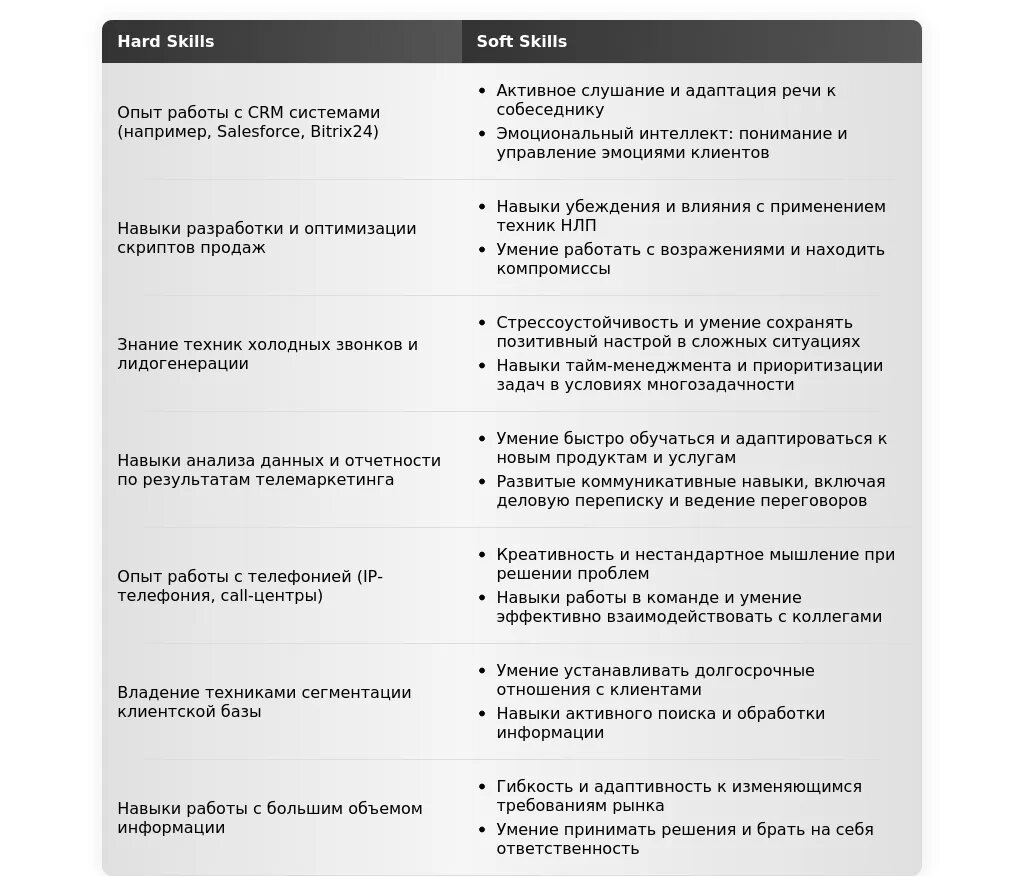 - На какие качества и навыки делать акцент: Коммуникабельность, умение убеждать, стрессоустойчивость, обучаемость, знание техник продаж.