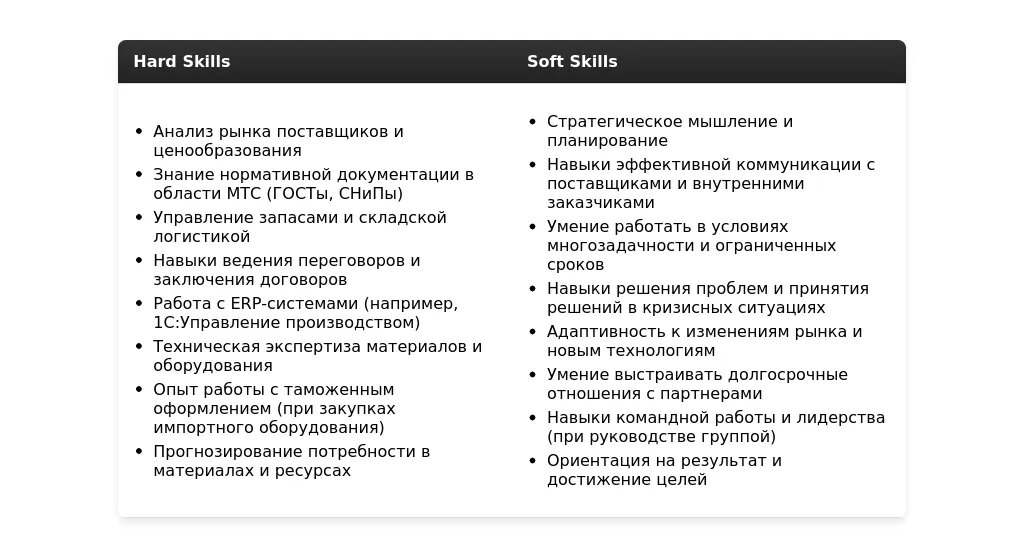 - Строительство: "Обеспечение своевременной поставки материалов на строительную площадку", "Работа с нормативной документацией (ГОСТы, СНиПы)", "Контроль качества поставляемых материалов", "Взаимодействие с подрядчиками".