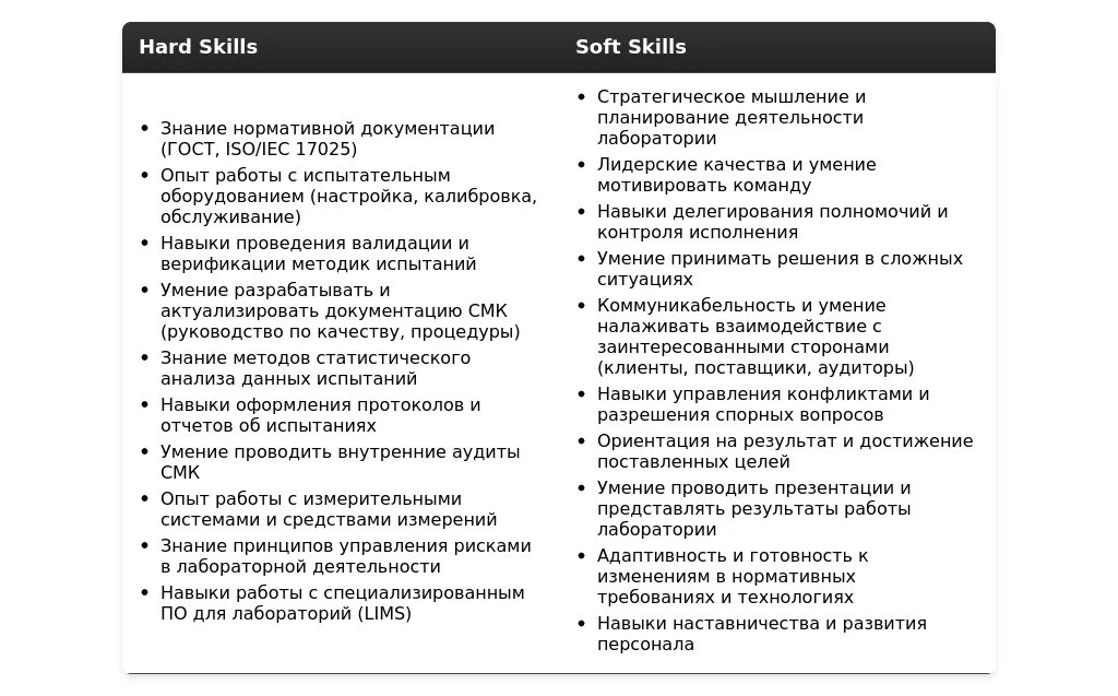 - Управленческие навыки: Управление персоналом, планирование работы лаборатории, организация обучения персонала.