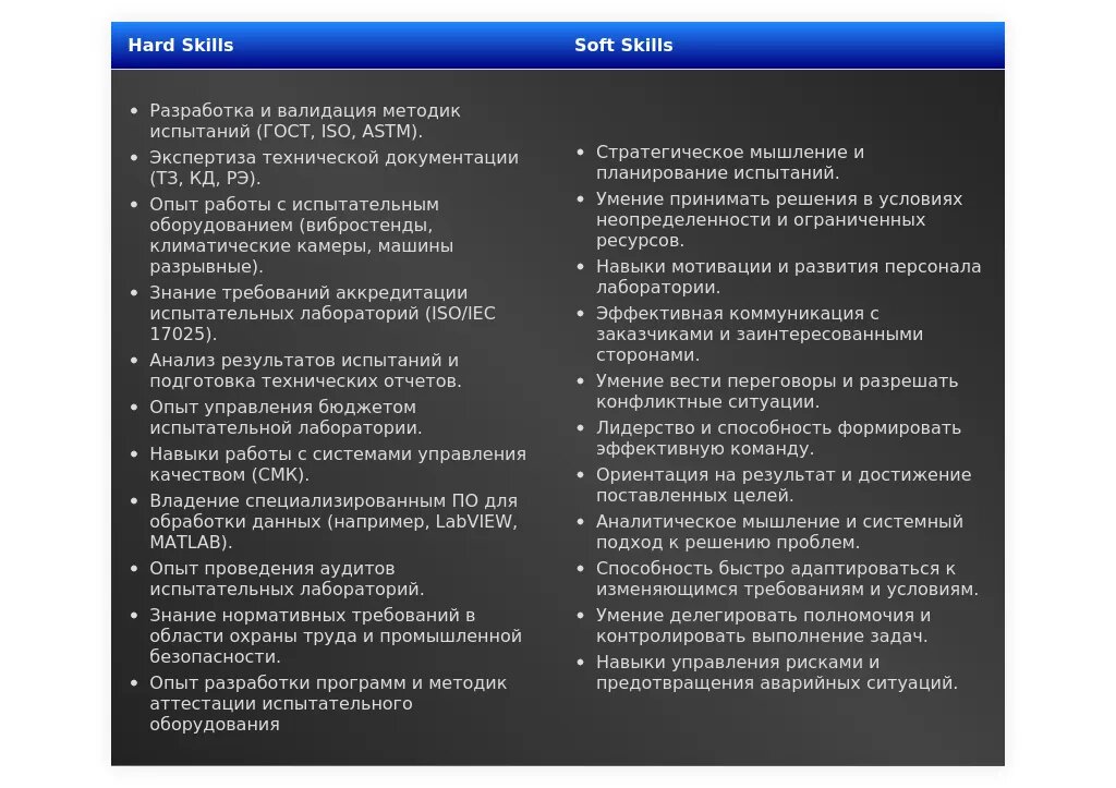"Технические навыки: Знание ГОСТов в области [указать область], проведение механических испытаний, химический анализ, работа с измерительным оборудованием. Управленческие навыки: Управление персоналом, планирование работы лаборатории, контроль качества. Навыки работы с компьютером: MS Office, [указать специализированное ПО]."