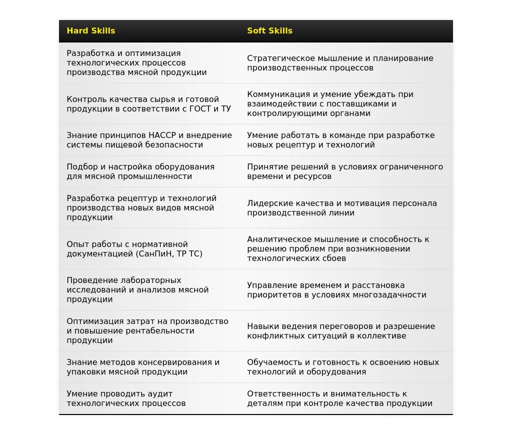 - Особые навыки: Технолог-разработчик новых видов мясной продукции, Главный технолог по качеству мясной продукции.