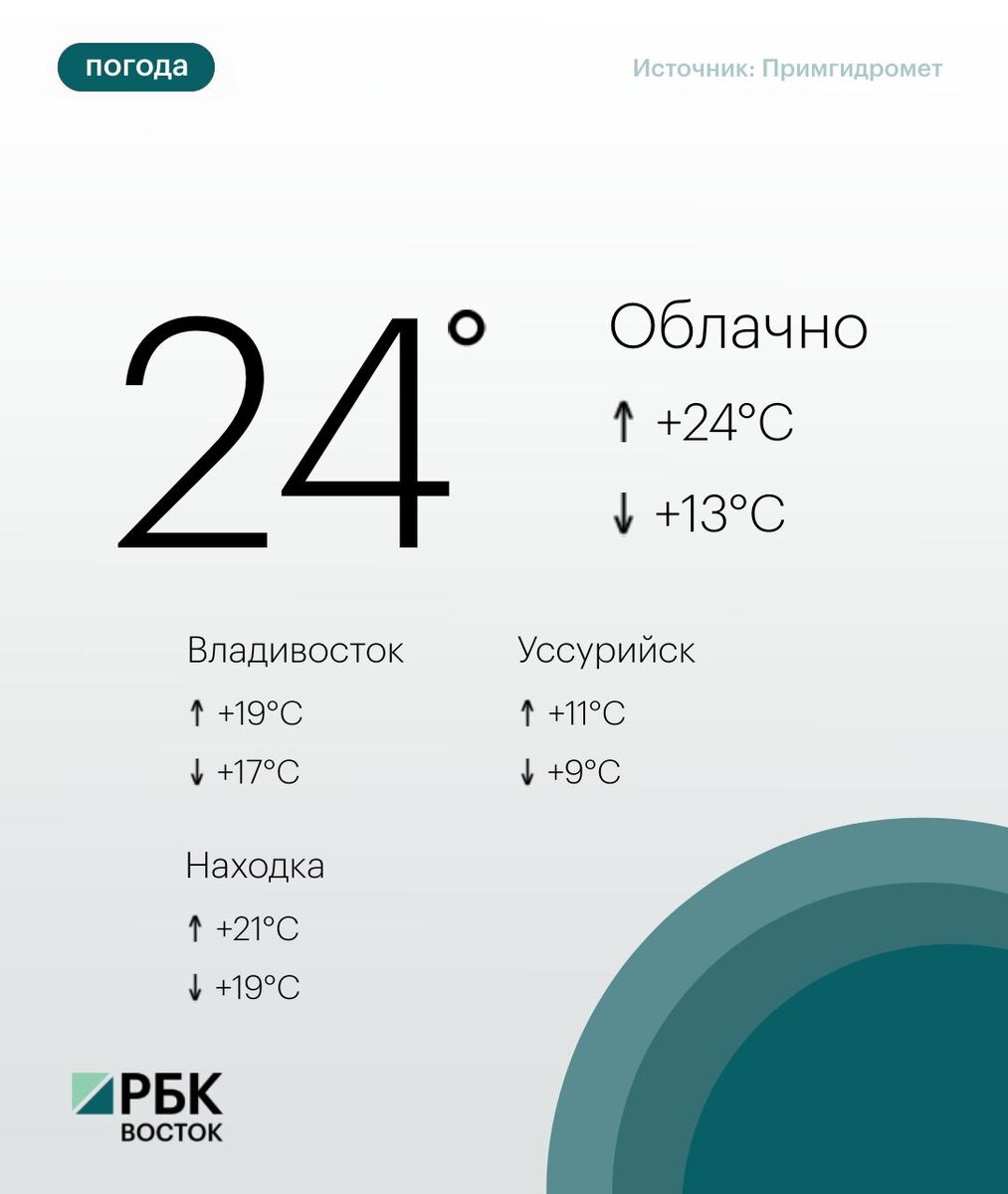 Сегодня погоду в Приморье определяет поле пониженного атмосферного давления. Днем местами кратковременный дождь. Утром в отдельных районах туман. Ветер юго-западный умеренный. Температура воздуха днем +13...+24°C 🌧