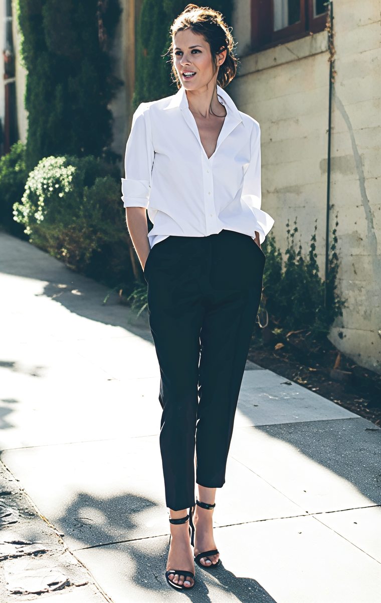 Прямые брюки со средней посадкой — основа делового и повседневного гардероба. Они не должны быть слишком облегающими или мешковатыми. Правильная длина — когда край брючины слегка касается каблука обуви.
