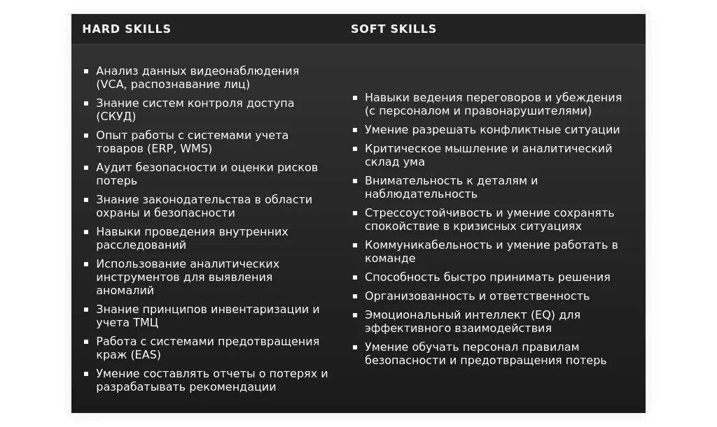 - Для руководящих должностей: "Разработка и внедрение мер по снижению потерь", "Организация работы службы безопасности", "Взаимодействие с правоохранительными органами", "Управление командой".