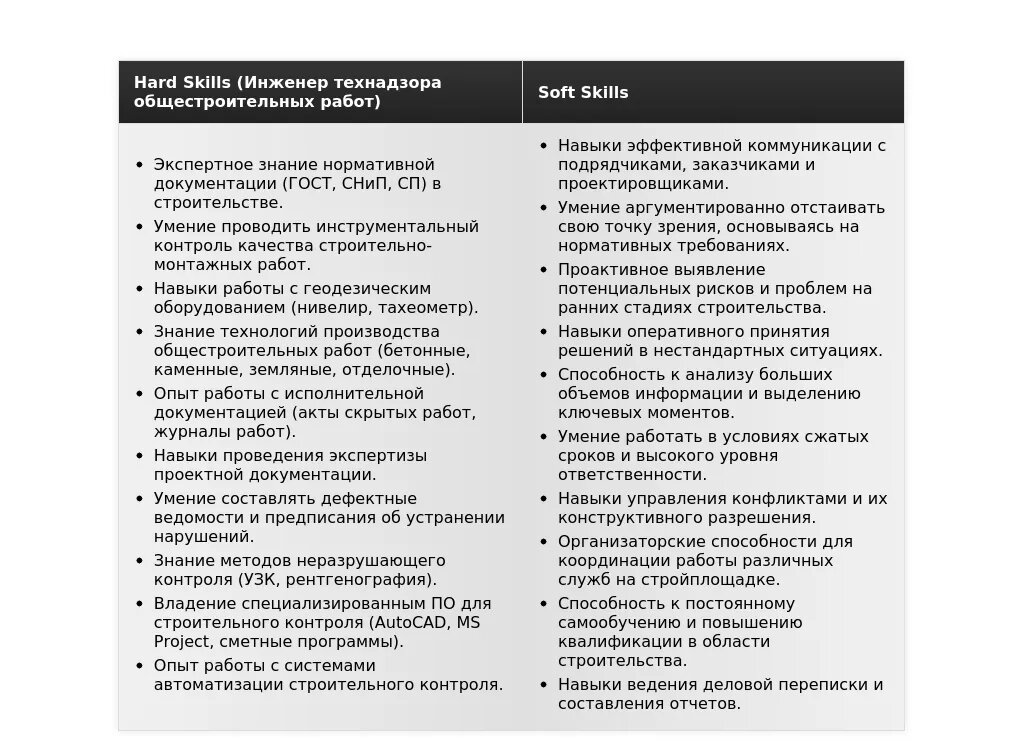 Проведение строительного контроля, знание нормативной документации (СНиП, ГОСТ), составление актов и отчетов, AutoCAD, MS Office, работа в команде, ответственность, исполнительность.