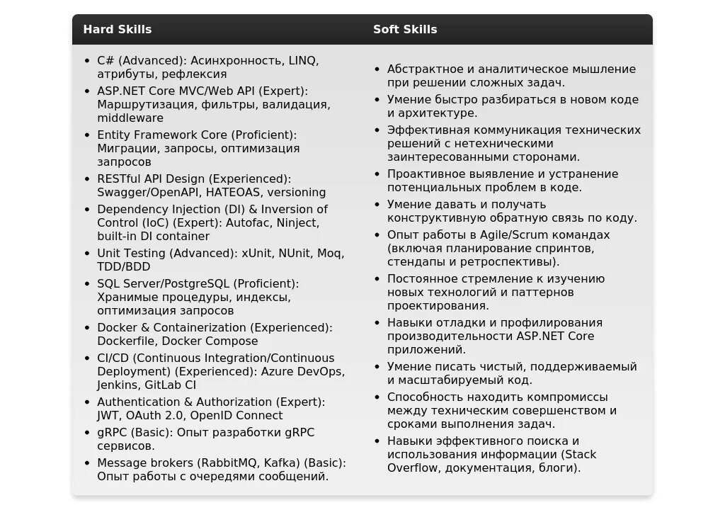 - Навыки: Список навыков должен соответствовать требуемым компетенциям.